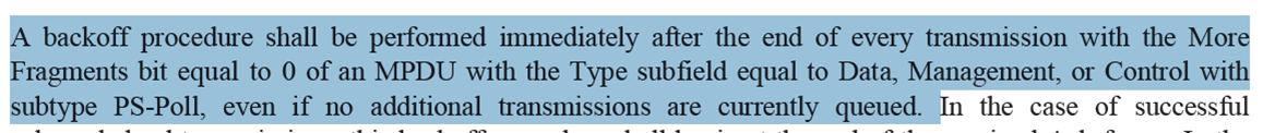 if no additional transmissions are currently queued. This means that even if there is no additional data to be transmitted, performing a backoff operation after each transmission is a mandatory procedure. Therefore, I chose to reject this comment rather than