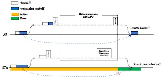 - YC: No, it doesn’t means the STA must be in doze state. CID #4462 raised that when the STA operates on NPCA PC and sets PS Management subfield to 1 to go to doze state, the STA won’t resume the backoff procedure after it switches back to the BSS PC.