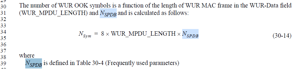 For your comment #2, I think it’s better to keep the definition of N_SPDB in the Mathematical description of signal. In 11ba, N_SPDB is different for LDR and HDR. In 11bp, it is also different for MCS with BCC and MCS without BCC. And, similar to below spec text in 11ba, expect that this parameter will be used in other subclauses as well.
