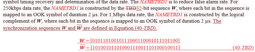 For 250kbps data rate, the NAMETBD1 is constructed by the 32-bit sequence W, where each bit in the sequence is mapped to an OOK symbol of duration 2 µs. For 1 Mbps data rate, the NAMETBD1 is constructed by the logical complement of W, where each bit in the sequence is mapped to an OOK symbol of duration 2 µs.