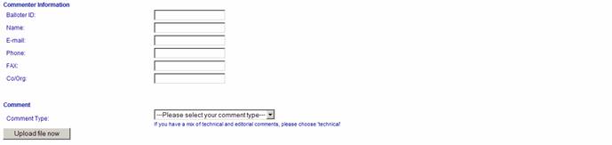 Enter values in these boxes: Name, Email address, Phone number, Fax (optional), and Affiliation Comment type - select "Technical" if any technical comments are included or "Editorial" otherwise.