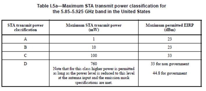 6: Wireless Access in Vehicular Environments, July 2010. When assuming class C, the max. permitted e.i.r.p. is limited to 33dBm and the max. output power (at the antenna input) is specified as 100mW