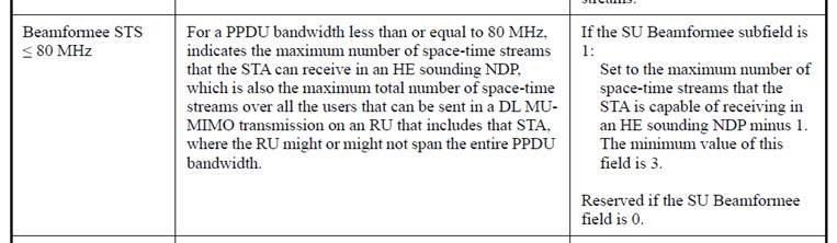 This field describes the number of “streams” a STA can receive, either as part of a sounding frame or as part of MU-MIMO frame.