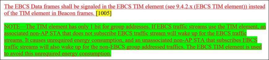 to wake up for the non-EBCS group addressed traffic. Usage of EBCS TIM element helps avoid such unnecessary power consumption for both category of STAs. Reasoning: