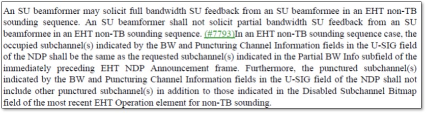 That sounds better. J Best regards, Jinyoung From: Zinan Lin [mailto:Zinan.Lin@xxxxxxxxxxxxxxxx] Jinyoung, Thank you for your suggestion. “feedback-requested RU/MRU size” does not sound grammatically correct. How about using “feedback RU/MRU size” as indicated in Table 9-42c? The revised sentence is given as follows: The EHT beamformer shall set the TXVECTOR parameter CH_BANDWIDTH or CH_BANDWIDTH_IN_NON_HT, the Partial BW Info subfield of the EHT NDP Announcement frame, depending on the operating channel width of the beamformee, the operating channel width of the beaformer or the feedback RU/MRU size, as defined in Table 9-42c (Settings for BW, Partial BW Info subfield in the EHT NDP Announcement frame(#8157)).