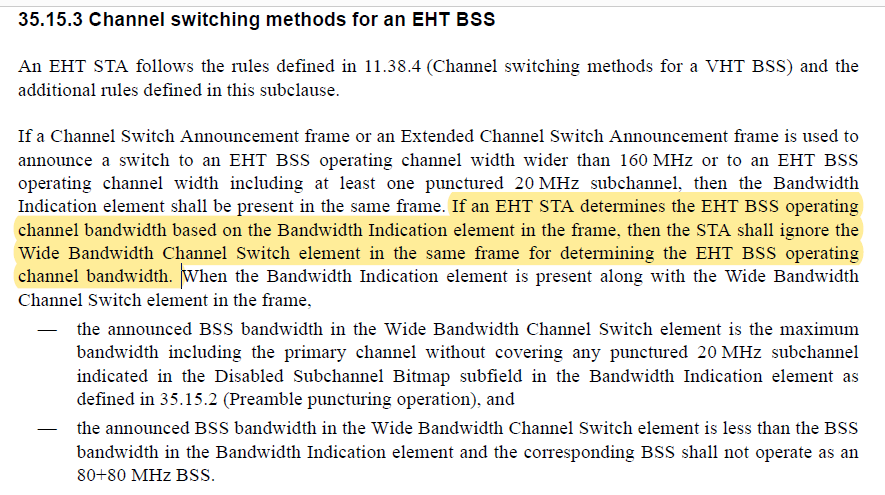 "If a Bandwidth Indication subelement is received by an EHT STA, the EHT STA uses the Bandwidth Indication subelement for determining the EHT BSS operating channel bandwidth and ignores the Wide Bandwidth Channel Switch subelement indication."