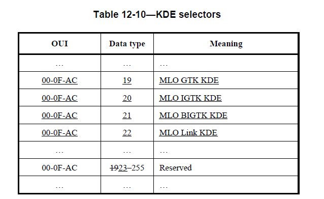 EdwardOn Tue, Jul 16, 2024 at 8:22 AM Jouni Malinen <jkmalinen@xxxxxxxxx> wrote:This does not match the ANA database. Why would amendment order override what ANA has already assigned?Furthermore, the P802.11be values 16-19 have already been deployed in significant number of devices and it is not realistic to expect those deployed devices to be modified. Yes, I understand that drafts may change and have such disclaimers, but there is really no justification for doing this change at this point in time taken into account that existing ANA allocation.I have an open comment against P802.11bh/D5.0 to fix the assigned values to match the ANA database.- JouniOn Tue, Jul 16, 2024 at 7:53 AM Edward Au <edward.ks.au@xxxxxxxxx> wrote:Dear Alfred and all,Because of the 11bh and 11be alignment, the data type value of KDE selectors (Table 12-10) will be updated as follows.In 11bh D5.0, it hasIn 11be future draft, we will have: