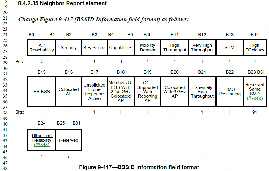 In CC50, when Same SMD and Ultra High Reliability are introduced in Figure 9-417—BSSID Information field format, B23 and B24 are used. Whilst in 11bf, B23 has already used B23.
