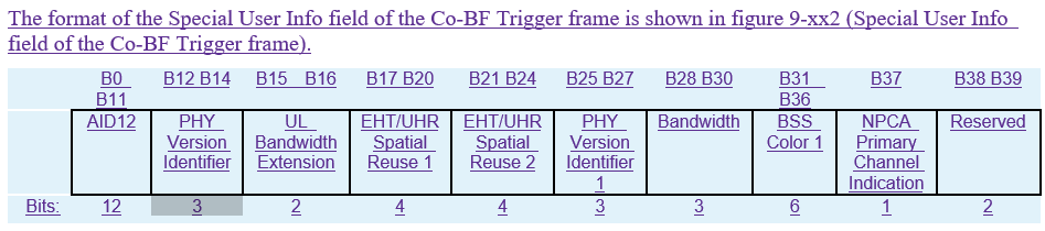 I have one comment on the special user info field. The specification already defined a mapping from B25-B36 of the special user info field to the B20-B25(BSS color 2 subfield) in U-SIG1 and B2