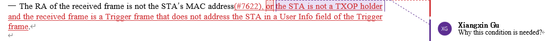 This is a similar condition for the intra-BSS NAV in the baseline Best Regards, Hongwon From: 顾祥新 (Xiangxin Gu) <000046f9987a2d10-dmarc-request@xxxxxxxxxxxxxxxxx> Hi Hongwon, Thank you for the discussion. Please find my comments and editorial changes attached. BR, Xiangxin Gu Institute of Communication Technology From: yuxin.lu <eeluyx@xxxxxxxxx> Hi Hongwon, Thanks for initiating the discussion. Following up on the resolution of CID 11184, the following paragraph implies that the BSS_COLOR parameter (if it exists) in the Co-TDMA TB ICR sent by the polled AP is set to the BSS color of the coordinating AP. In this case, I assume the non-AP STAs associated with the polled AP would classify the PPDU carrying this ICR as an inter-BSS PPDU if they only decode the PHY preamble. Do we need to clarify this NAV setting explicitly? A [홍이1] polled AP that responds to a Co-TDMA TB ICF sets the TXVECTOR parameters as defined in 37.4.2.3.2 (TXVECTOR parameters for UHR TB PPDU response to Trigger frame), where the rules related to a UHR non-AP STA also apply to a polled AP. On Wed, 15 Apr 2026 at 09:39, hongwon.lee <hongwon.lee@xxxxxxx> wrote: