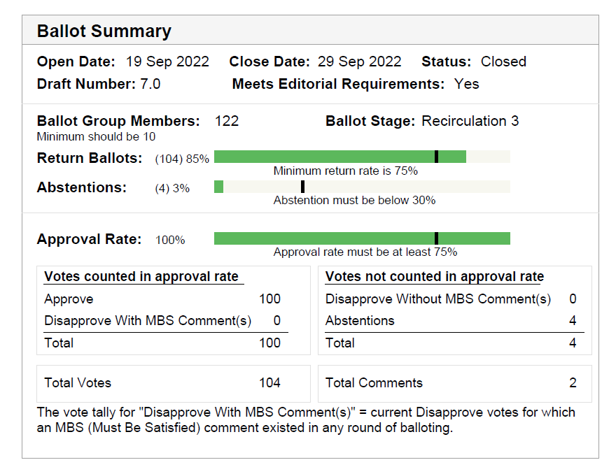Dear 802.11 members,The third recirculation SA ballot on P802.11az has closed.The ballot passed with 100% approval; 2 comments were received. Please see the results below.Congratulations to the WG on this result!Thank you,Dorothy==========================----------------------