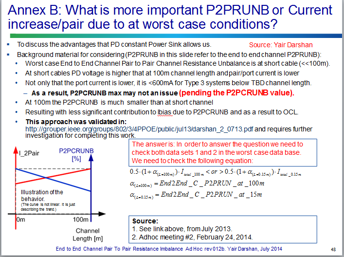 From: Darshan, Yair [mailto:YDarshan@xxxxxxxxxxxxx] Jeff, 1. The possibility of high current at short cable as opposed to the expectation of high current at 100m is known to us from our work on July 2013 and adhoc meeting and February 2013 from the analytical analysis. It depends on End to End Channel P2PRUNB and the absolute resistance of each component in the system. Please see Annex B from adhoc material attached below with simulations that confirmed it. In Short it depends on the following: