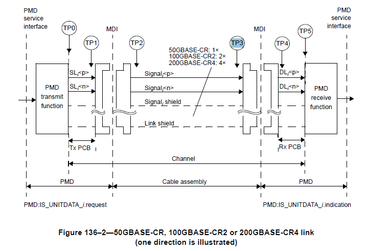 If we want to go further in specifying requirements and include more than just the link segment, “channel”  (1.4.179) is often used for these purposes (but see below for a more rigorous approach - test points). “channel” has been a bit of a hot-button in 802.3 specs, and, except for systems which use a notion of a channel as a frequency (like a radio or TV channel), is usually locally defined within clauses (“a defined path along which an electrical or optical signal passes”).  As a result, the precise meaning, depends on the clause and the context, and therefore, in my opinion, the word “channel”, while common, is better avoided in 802.3 standards, and needs extra precision. (because the reader THINKS they know it, but it has some specific, precise meaning).  However, for us, and often elsewhere, channel is useful to mean everything between the PMA/PMD (transmitter) and PMA/PMD (receiver), including PCB and MDI.