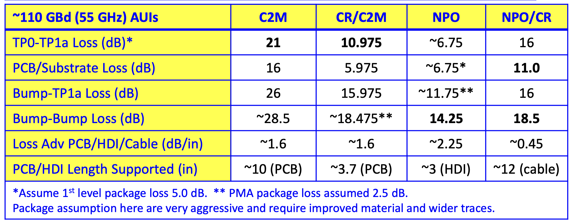 Just a note of cautions the assumed package loss of 5.0 dB used in the table below with further investigation is optimistic even for next Gen substrate material at least on the high radix switches.