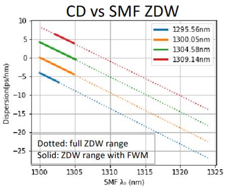 - In your October presentation you mentioned “Uniform distribution of ZDW is unrealistic and it overestimates FWM probability”. How would the analysis turn out if we would use a less rigid approach like distribution between 1303 and 1322nm? Flat versus Gaussian. It would be helpful to understand if we are close to running off a cliff or not.