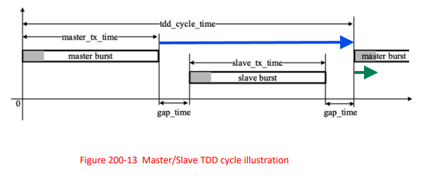 Baseline_Text_for_TDD_PHY_V1.1_07_14_25.pdf. The blue arrow represents the quiet period for the Master and the green arrow represents the duration of the refresh header for the Master. No data is transmitted by the Master during the quiet period and the