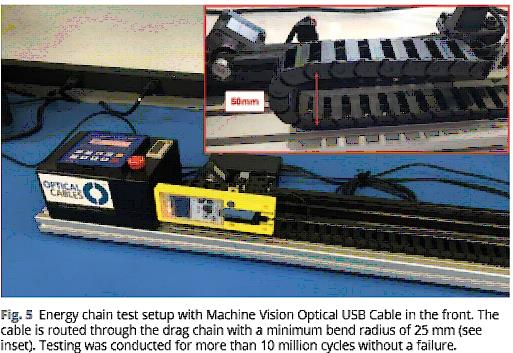 stage is such that the energy chain exhibits a 180° turn with a bending radius of only 25 mm. The travel of the stage was 350 mm and the setup ran with a cycle frequency of 1 Hz. The optical cable was fixed to the energy chain at the ends of the chain only