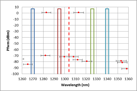first plot below is a first cut that seems to work. I don't think it will be possible to find a working plan that straddles the zero dispersion window if one of the channels is uncooled due to the wide range of FWM frequencies (see 2nd plot). For the purposes of illustrating coexistence in the liaison, we may want to show the non-uniform plan below or a simpler LAN-WDM Plan D with all four channels in O+ band. Non-uniform plan: 1270, 1295, 1326, 1340nm with 3nm passband