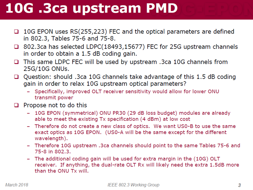 Bill, Personally I don’t think the 10G US will need that much of a boost. Hopefully we can reference much of the current spec for 10G US. Duane, Marek, Relative to the comments on Item 1 below, wouldn't the mandatory FEC function still be defined in CL 142 for the "802.3ca" 10G rate that could share the "first" 25G US wavelength in a TDM manner that we're defining as part of this standard? i.e. - not the standard 10G EPON rate or upstream wavelength. Regards, Bill