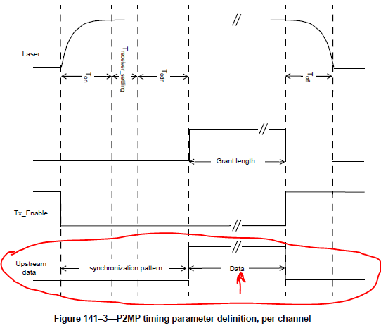 Bill,  I donâ??t mind adding any information to the figure if it clarifies things. But the circled line is wrong.  First, the text you highlighted only refers to the data transmitted during the Ton and Toff measurement tests. It has nothing to do with the last line in the figure, which shows synchronization pattern transitioning into a data pattern. This line was originally included (in clause 60) as an attempt to show how to detect the end time of Tcdr interval. But this line is wrong. The number of sync patterns that ONU generates is a parameter provisioned by management. It always must be larger than the actual Tcdr. The test and the diagram need to show how to measure the actual Tcdr.  Maybe one way to test it is to start with provisioning a small sync pattern length and to slowly keep increasing it until we have no missing bursts in 48 hours. But that requires up to 48-hr wait at each step. We should be discussing this on the reflector.  -Glen  From: Powell, Bill (Nokia - US/Raleigh) [mailto:bill.powell@xxxxxxxxx]  Hey Glen, Your updated Fig. 141-3 that you presented last week looks like this: