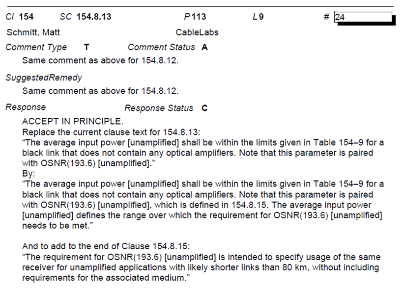 After reviewing your proposed change with that clarification in mind, I believe that a potentially simpler solution would be to simply accept Eric’s proposed remedy as is, or when moving that sentence from 154.8.15 to 154.8.13 to change it into a Note.  His central point is that in an unamplified application the limitation is the power and not the OSNR; therefore, the note about channel loss better fits in the section regarding input power rather than OSNR.  I agree with that statement.